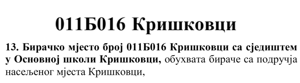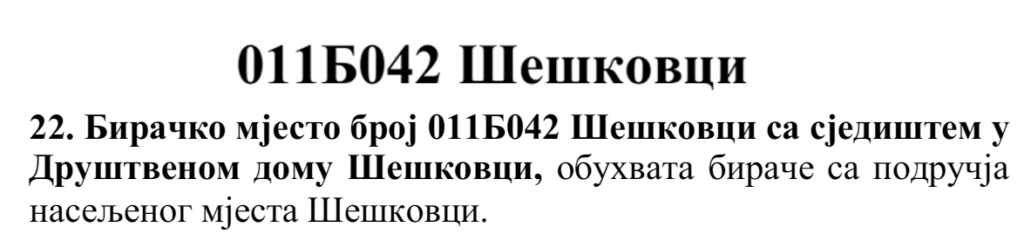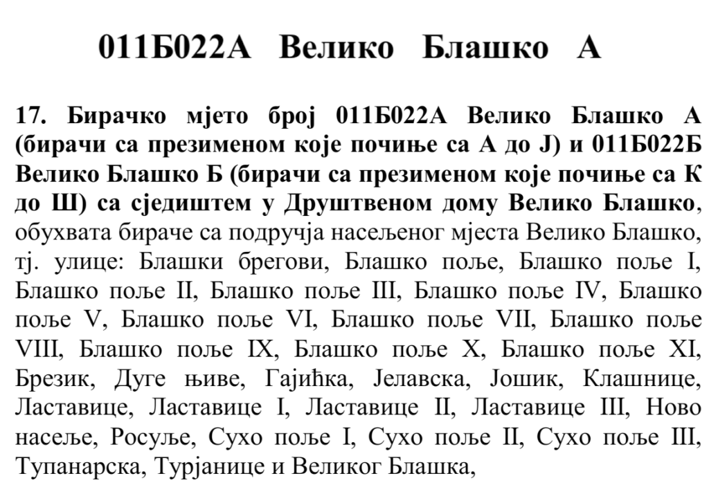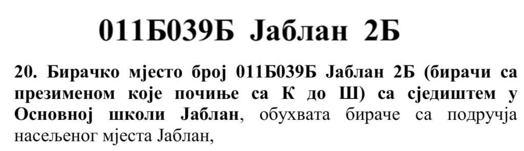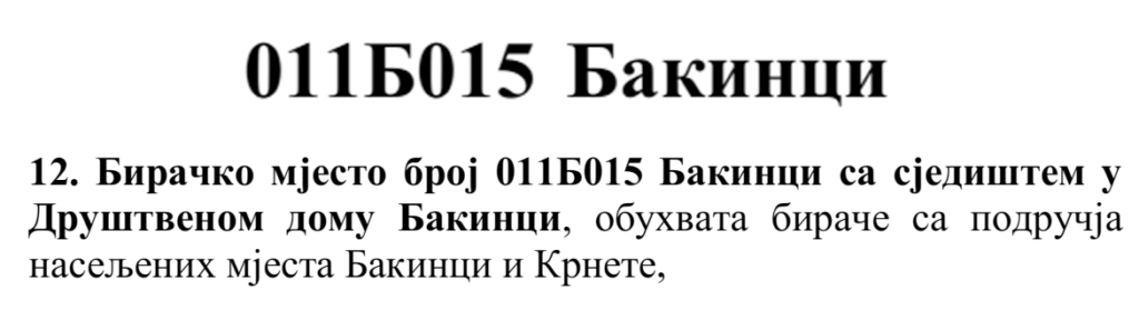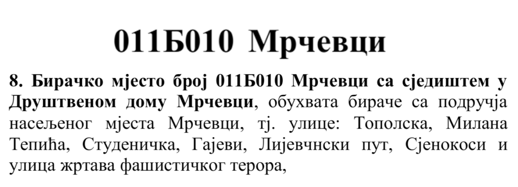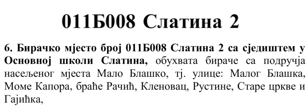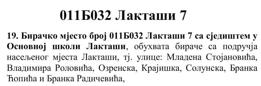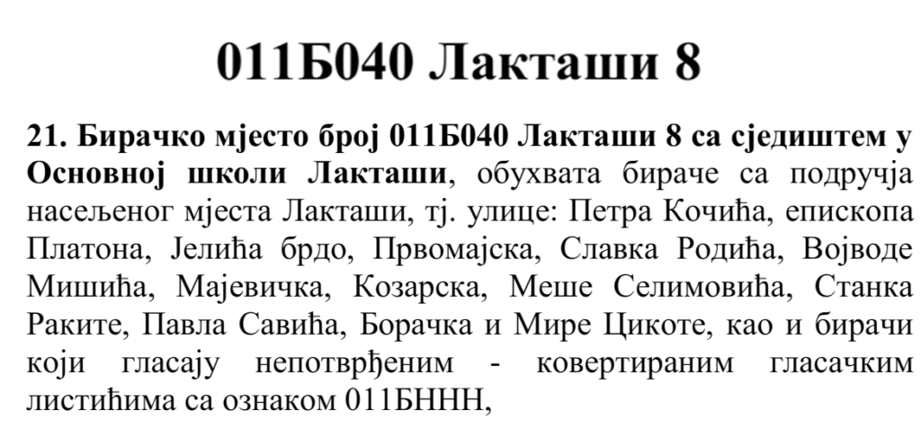 У овом документу још стоји да бирач који је стицањем пунољетства први пут уписан у Централни бирачки списак од дана закључења Централног бирачког списка до дана избора, а који бирачком одбору преда потврду издату од Центра за бирачки списак којом потврђује да се његово име не налази уписано ни на једном изводу из Централног бирачког списка и бирач који се налази на списку који је доставила Централна изборна комисија БиХ о држављанима БиХ који су уписани у извод из Централног бирачког списка за гласање изван земље имају право да гласају непотврђеним – ковертираним гласачким листићима на бирачком мјесту број 011Б040 Лакташи 8 са сједиштем у Основној школи Лакташи.