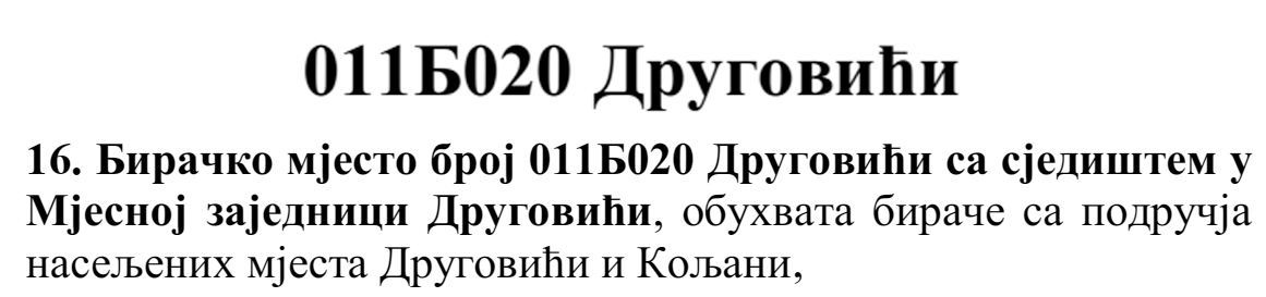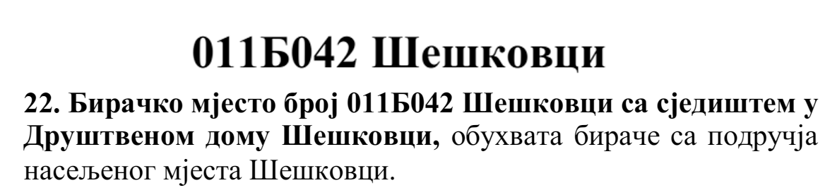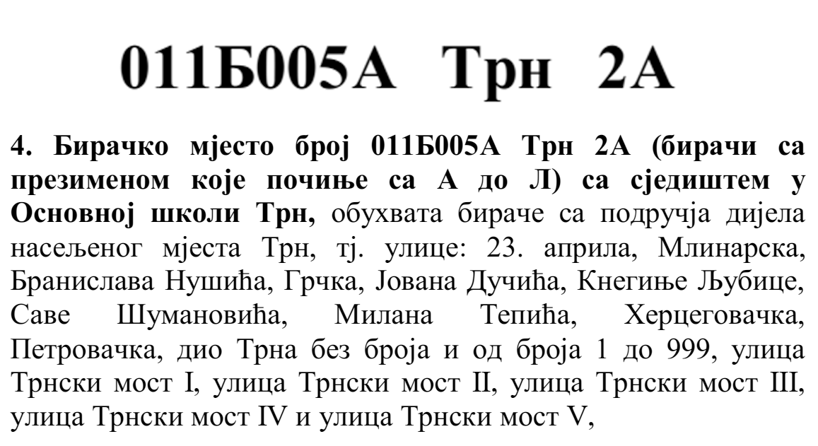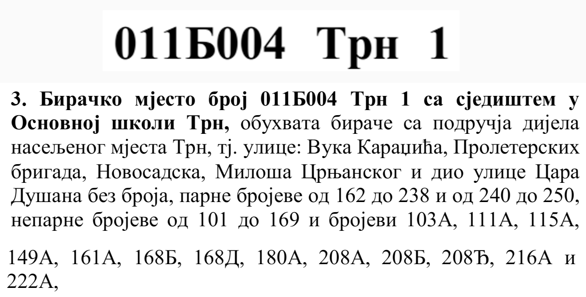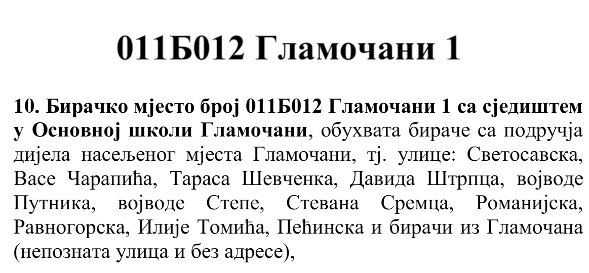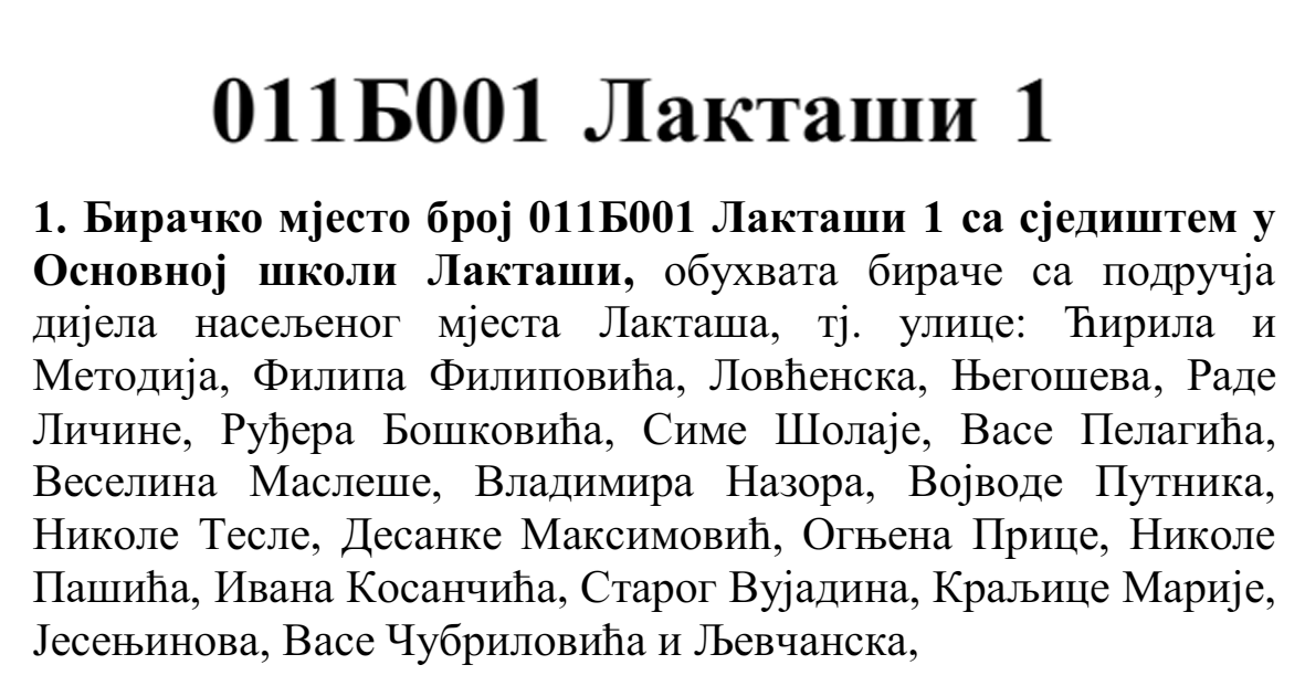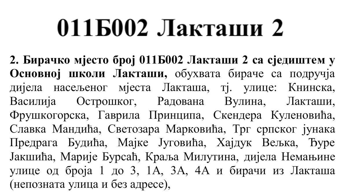 У овом документу још стоји да бирач који је стицањем пунољетства први пут уписан у Централни бирачки списак од дана закључења Централног бирачког списка до дана избора, а који бирачком одбору преда потврду издату од Центра за бирачки списак којом потврђује да се његово име не налази уписано ни на једном изводу из Централног бирачког списка и бирач који се налази на списку који је доставила Централна изборна комисија БиХ о држављанима БиХ који су уписани у извод из Централног бирачког списка за гласање изван земље имају право да гласају непотврђеним – ковертираним гласачким листићима на бирачком мјесту број 011Б040 Лакташи 8 са сједиштем у Основној школи Лакташи.